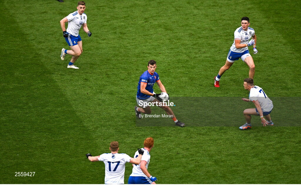 1 July 2023; Armagh goalkeeper Ethan Rafferty is surounded by Monaghan defenders during the GAA Football All-Ireland Senior Championship quarter-final match between Armagh and Monaghan at Croke Park in Dublin. Photo by Brendan Moran/Sportsfile
