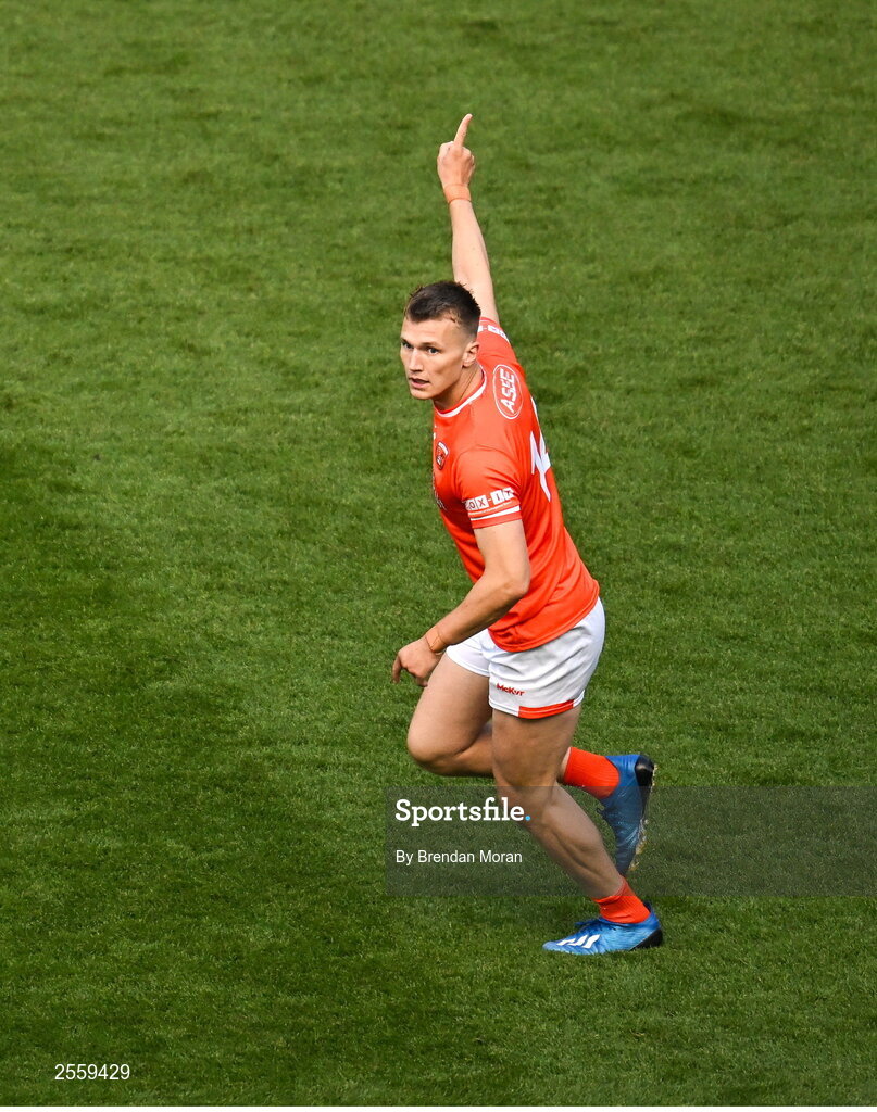 1 July 2023; Rian O'Neill of Armagh celebrates after kicking an equalising point at the end of extra time in the GAA Football All-Ireland Senior Championship quarter-final match between Armagh and Monaghan at Croke Park in Dublin. Photo by Brendan Moran/Sportsfile