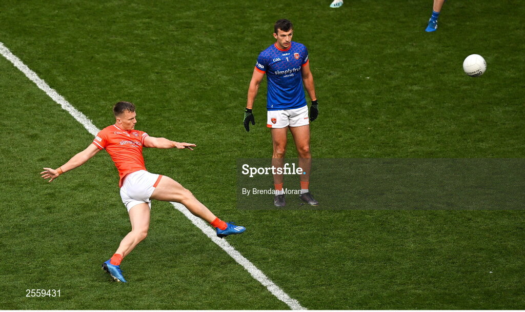 1 July 2023; Rian O'Neill of Armagh kicks an equalising point at the end of extra time in the GAA Football All-Ireland Senior Championship quarter-final match between Armagh and Monaghan at Croke Park in Dublin. Photo by Brendan Moran/Sportsfile