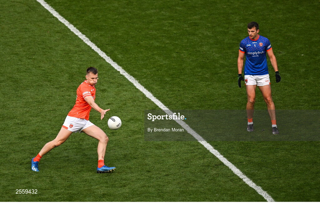 1 July 2023; Rian O'Neill of Armagh kicks an equalising point at the end of extra time in the GAA Football All-Ireland Senior Championship quarter-final match between Armagh and Monaghan at Croke Park in Dublin. Photo by Brendan Moran/Sportsfile
