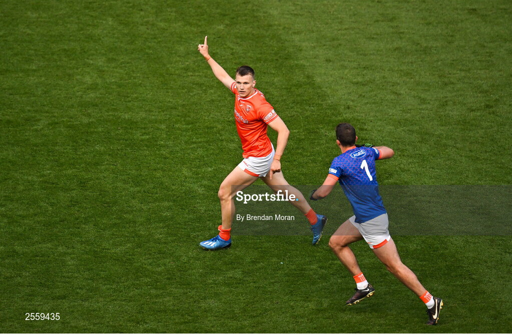 1 July 2023; Rian O'Neill of Armagh, left, celebrates after kicking an equalising point at the end of extra time in the GAA Football All-Ireland Senior Championship quarter-final match between Armagh and Monaghan at Croke Park in Dublin. Photo by Brendan Moran/Sportsfile