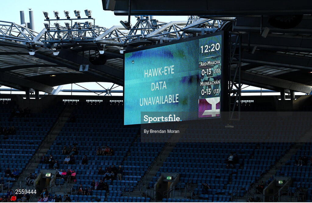 1 July 2023; A notice signalling that Hawkeye on unavailable to make a determination on a potential score during the GAA Football All-Ireland Senior Championship quarter-final match between Armagh and Monaghan at Croke Park in Dublin. Photo by Brendan Moran/Sportsfile