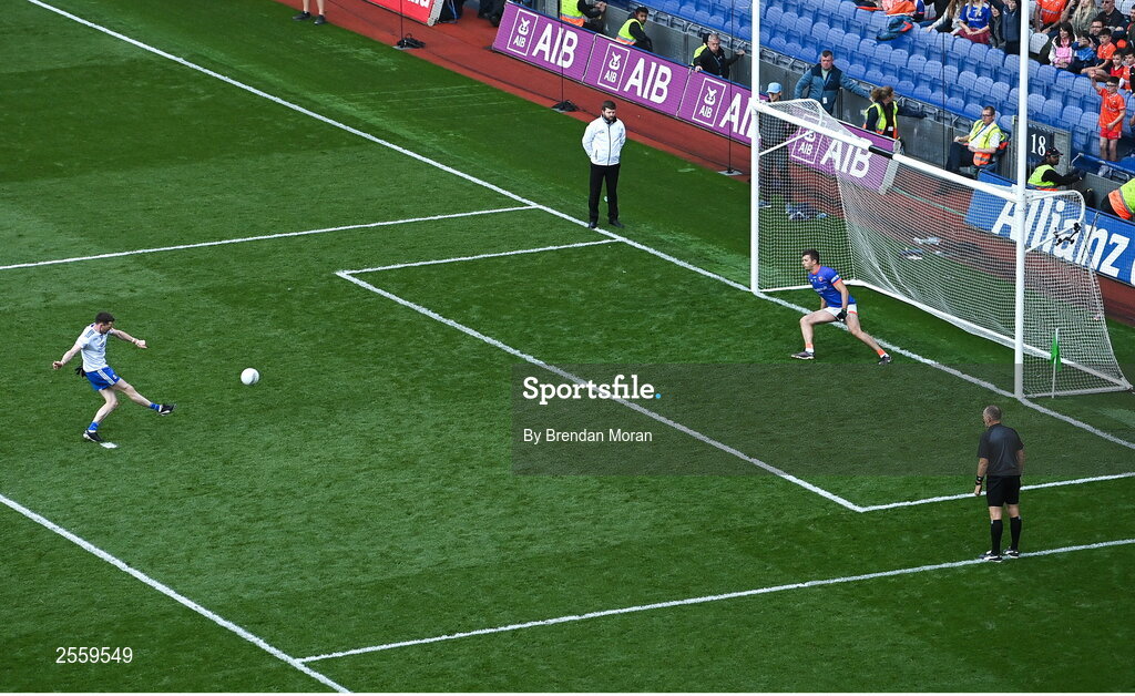 1 July 2023; Conor McManus of Monaghan scores his side's first penalty past Armagh goalkeeper Ethan Rafferty in the penalty shoot out during the GAA Football All-Ireland Senior Championship quarter-final match between Armagh and Monaghan at Croke Park in Dublin Photo by Brendan Moran/Sportsfile