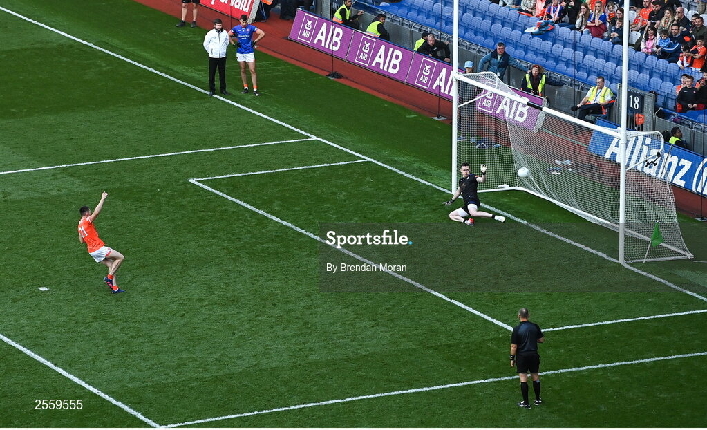 1 July 2023; Shane McPartlan of Armagh scores his side's second penalty past Monaghan goalkeeper Rory Beggan in the penalty shoot out during the GAA Football All-Ireland Senior Championship quarter-final match between Armagh and Monaghan at Croke Park in Dublin Photo by Brendan Moran/Sportsfile