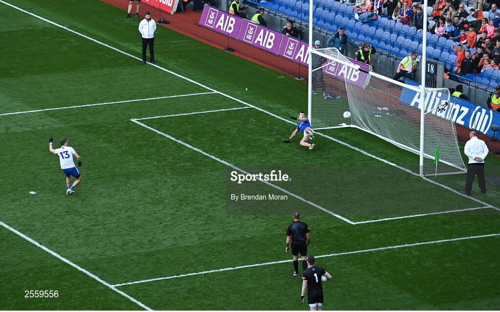 1 July 2023; Jack McCarron of Monaghan scores his side's second penalty past Armagh goalkeeper Ethan Rafferty in the penalty shoot out during the GAA Football All-Ireland Senior Championship quarter-final match between Armagh and Monaghan at Croke Park in Dublin Photo by Brendan Moran/Sportsfile