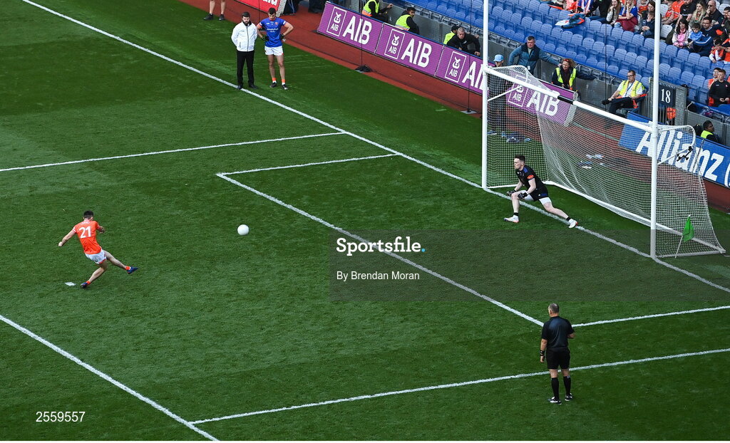 1 July 2023; Shane McPartlan of Armagh scores his side's second penalty past Monaghan goalkeeper Rory Beggan in the penalty shoot out during the GAA Football All-Ireland Senior Championship quarter-final match between Armagh and Monaghan at Croke Park in Dublin Photo by Brendan Moran/Sportsfile