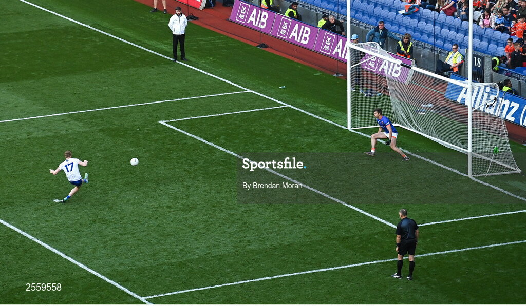1 July 2023; Kieran Hughes of Monaghan scores his side's third penalty past Armagh goalkeeper Ethan Rafferty in the penalty shoot out during the GAA Football All-Ireland Senior Championship quarter-final match between Armagh and Monaghan at Croke Park in Dublin Photo by Brendan Moran/Sportsfile