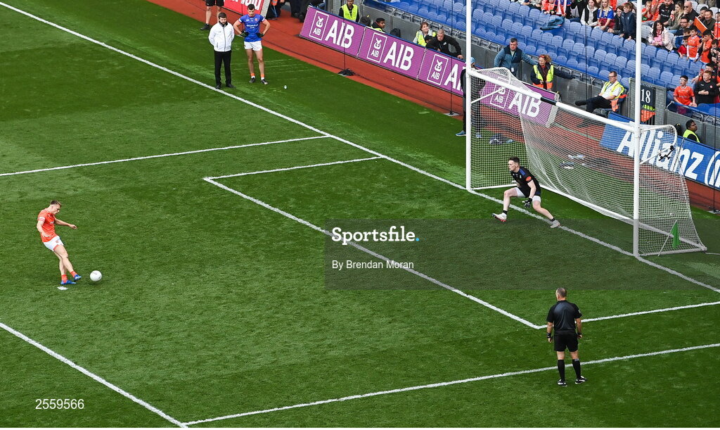 1 July 2023; Rian O'Neill of Armagh scores his side's sixth penalty past Monaghan goalkeeper Rory Beggan in the penalty shoot out during the GAA Football All-Ireland Senior Championship quarter-final match between Armagh and Monaghan at Croke Park in Dublin Photo by Brendan Moran/Sportsfile