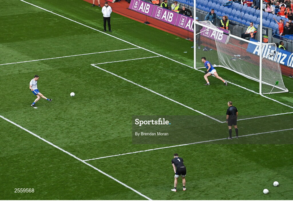 1 July 2023; Conor McManus of Monaghan scores his side's sixth penalty past Armagh goalkeeper Ethan Rafferty in the penalty shoot out during the GAA Football All-Ireland Senior Championship quarter-final match between Armagh and Monaghan at Croke Park in Dublin Photo by Brendan Moran/Sportsfile