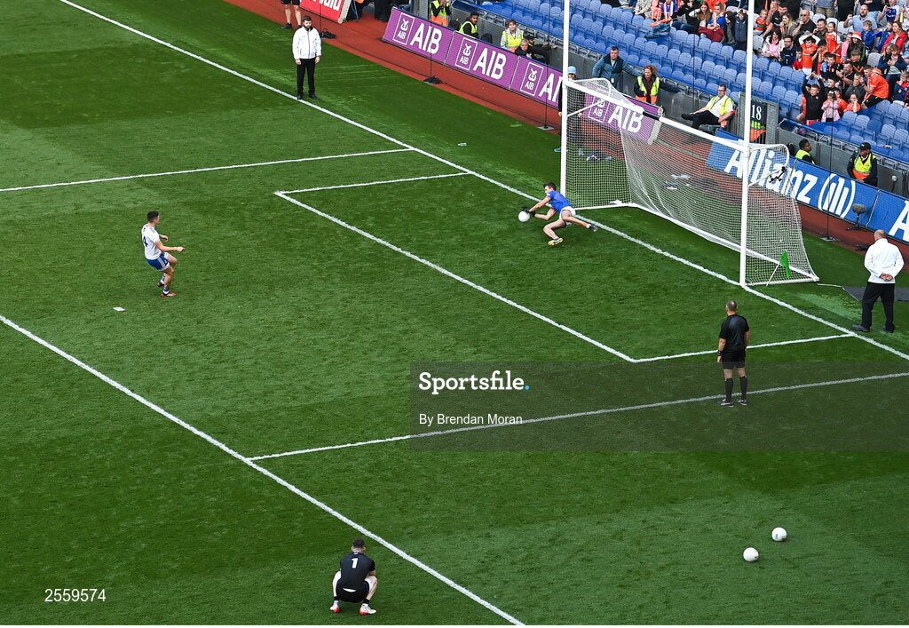 1 July 2023; Gary Mohan of Monaghan has his side's fifth penalty saved by Armagh goalkeeper Ethan Rafferty in the penalty shoot out during the GAA Football All-Ireland Senior Championship quarter-final match between Armagh and Monaghan at Croke Park in Dublin Photo by Brendan Moran/Sportsfile