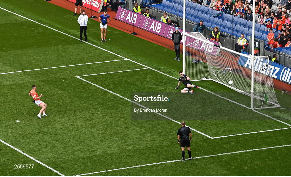 1 July 2023; Jason Duffy of Armagh scores his side's eighth penalty past Monaghan goalkeeper Rory Beggan in the penalty shoot out during the GAA Football All-Ireland Senior Championship quarter-final match between Armagh and Monaghan at Croke Park in Dublin Photo by Brendan Moran/Sportsfile