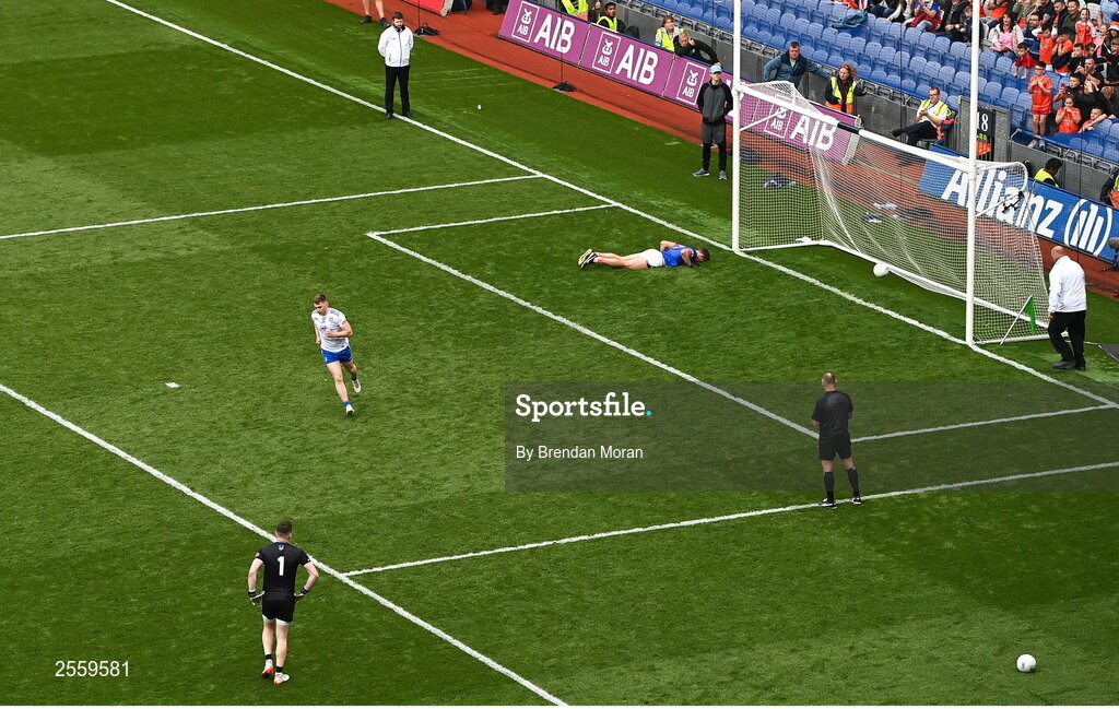 1 July 2023; Michael Bannigan of Monaghan celebrates after scoring his side's ninth penalty past Armagh goalkeeper Ethan Rafferty in the penalty shoot out during the GAA Football All-Ireland Senior Championship quarter-final match between Armagh and Monaghan at Croke Park in Dublin Photo by Brendan Moran/Sportsfile