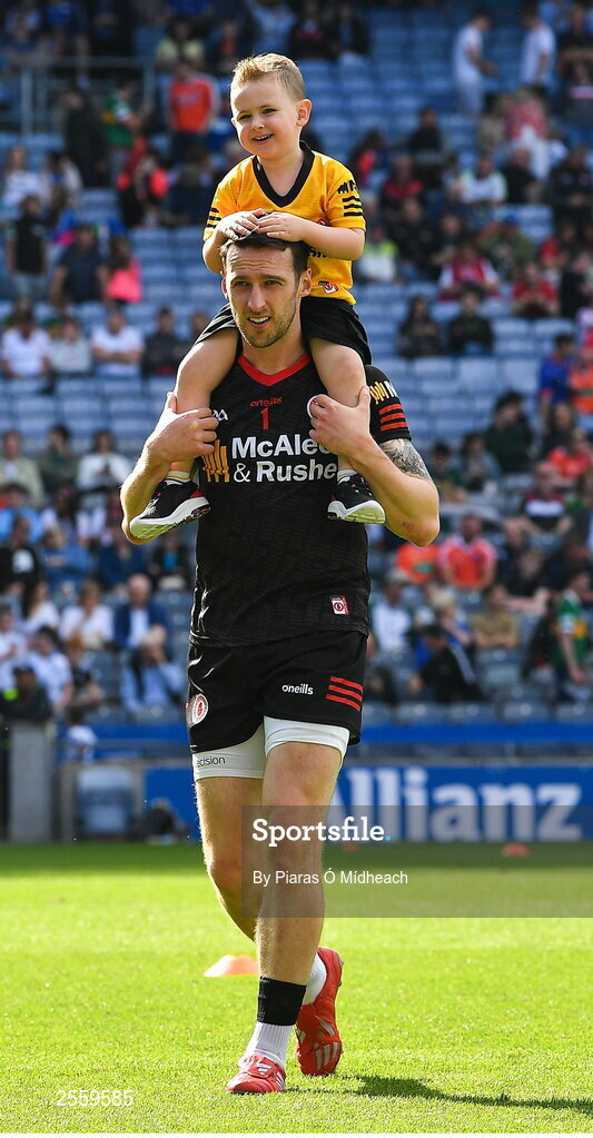 1 July 2023; Tyrone goalkeeper Niall Morgan with his son Christy, age 3, after the GAA Football All-Ireland Senior Championship quarter-final match between Kerry and Tyrone at Croke Park in Dublin. Photo by Piaras Ó Mídheach/Sportsfile