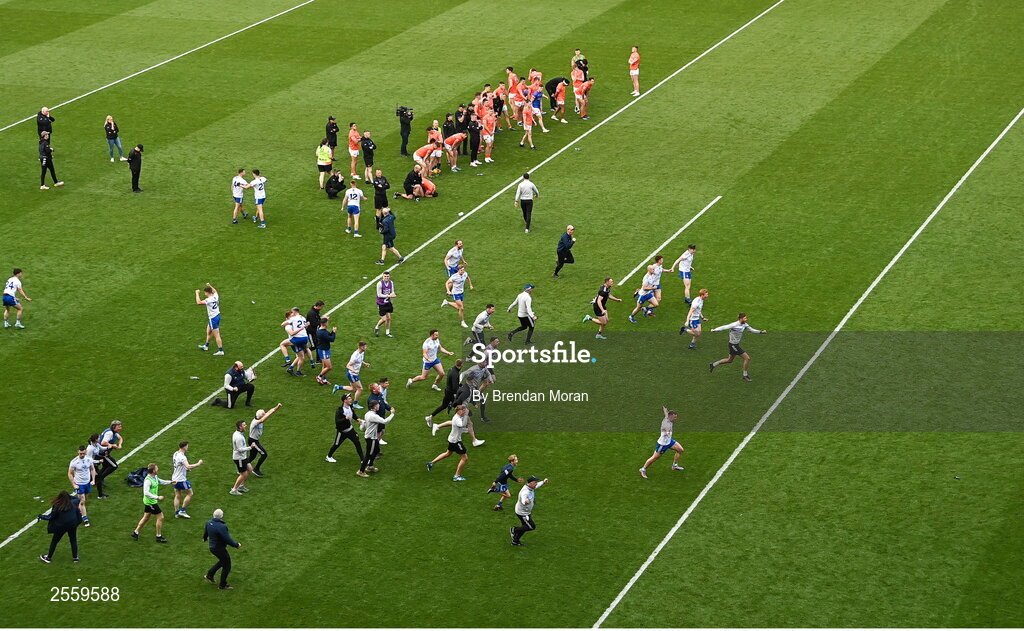 1 July 2023; Monaghan players and officials celebrate winning the penalty shoot out, as Armagh players and officials look on, during the GAA Football All-Ireland Senior Championship quarter-final match between Armagh and Monaghan at Croke Park in Dublin Photo by Brendan Moran/Sportsfile