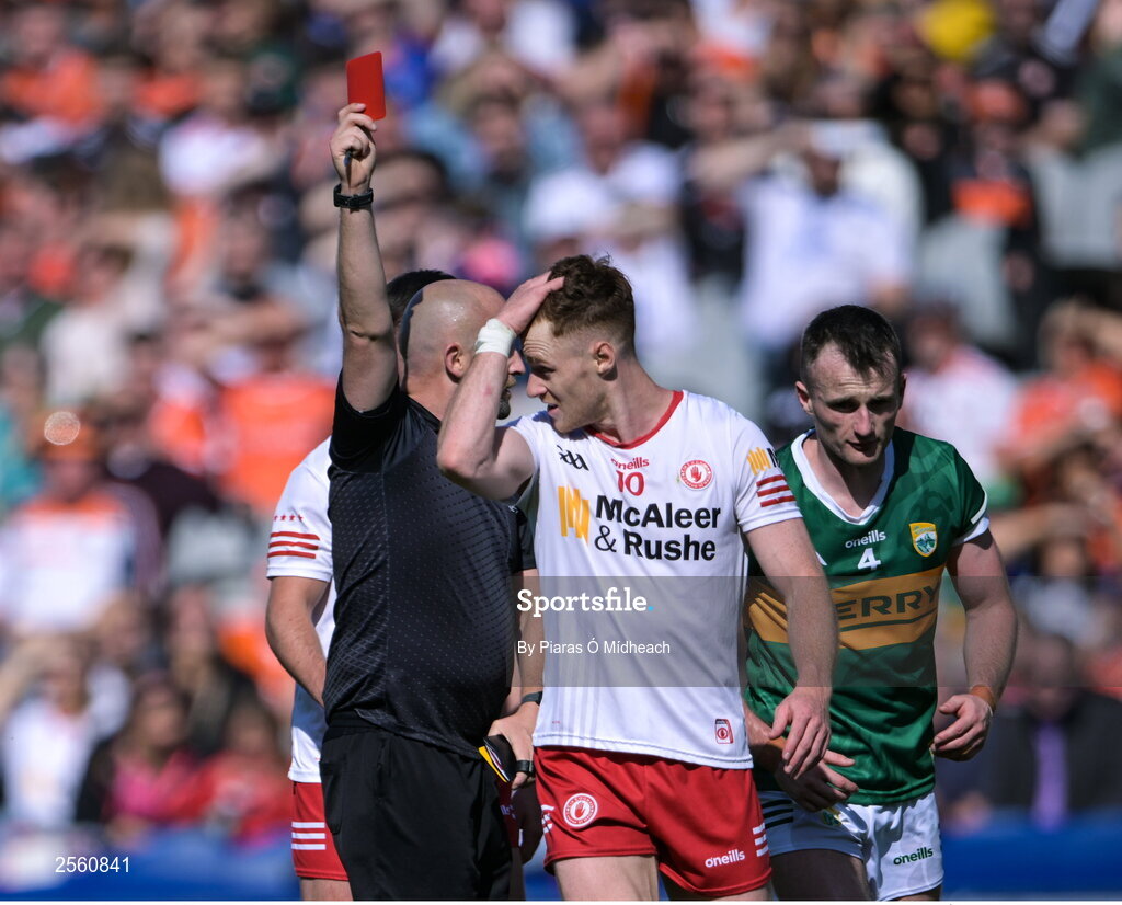 1 July 2023; Conor Meyler of Tyrone is shown the red card by referee Brendan Cawley during the GAA Football All-Ireland Senior Championship quarter-final match between Kerry and Tyrone at Croke Park in Dublin. Photo by Piaras Ó Mídheach/Sportsfile