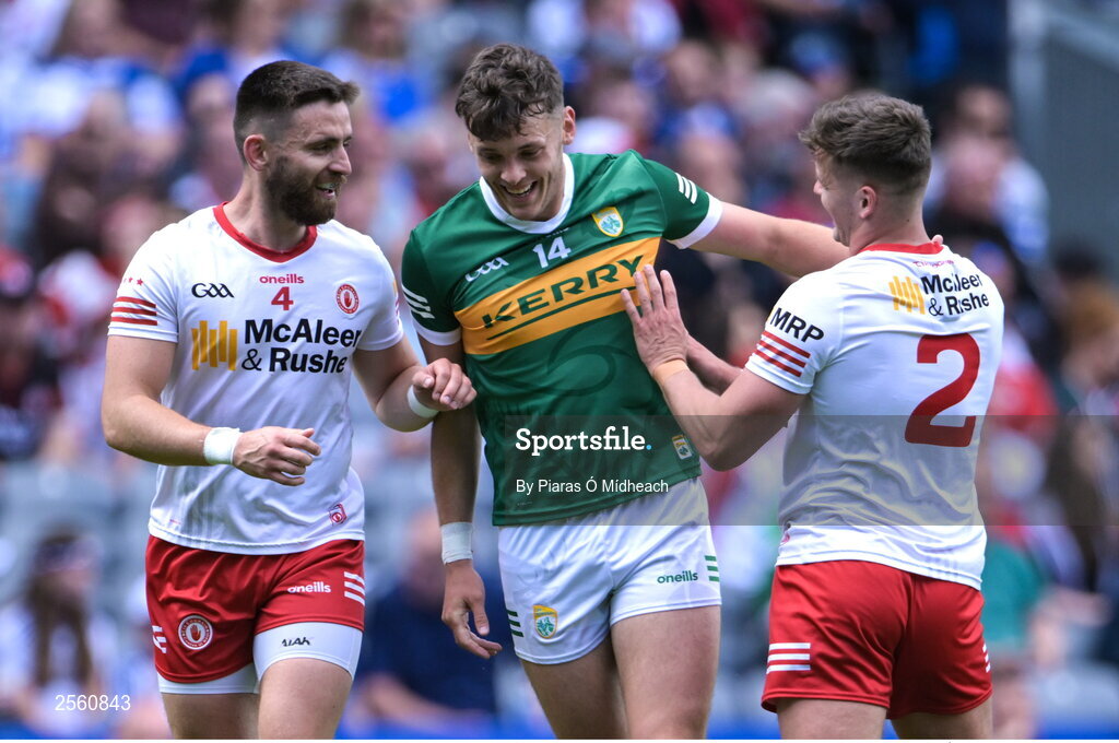 1 July 2023; David Clifford of Kerry shares a joke with Tyrone players Pádraig Hampsey, left, and Michael McKernan during the GAA Football All-Ireland Senior Championship quarter-final match between Kerry and Tyrone at Croke Park in Dublin. Photo by Piaras Ó Mídheach/Sportsfile