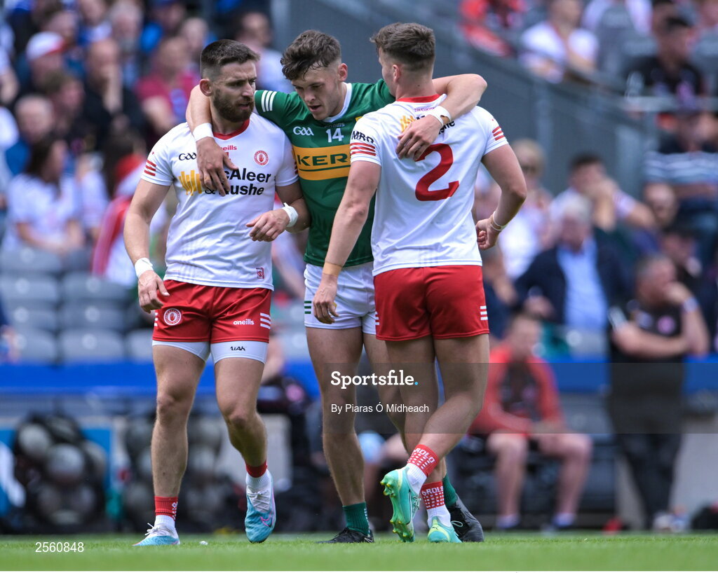 1 July 2023; David Clifford of Kerry shares a joke with Tyrone players Pádraig Hampsey, left, and Michael McKernan during the GAA Football All-Ireland Senior Championship quarter-final match between Kerry and Tyrone at Croke Park in Dublin. Photo by Piaras Ó Mídheach/Sportsfile