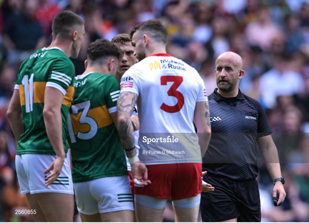 1 July 2023; Referee Brendan Cawley during the GAA Football All-Ireland Senior Championship quarter-final match between Kerry and Tyrone at Croke Park in Dublin. Photo by Piaras Ó Mídheach/Sportsfile