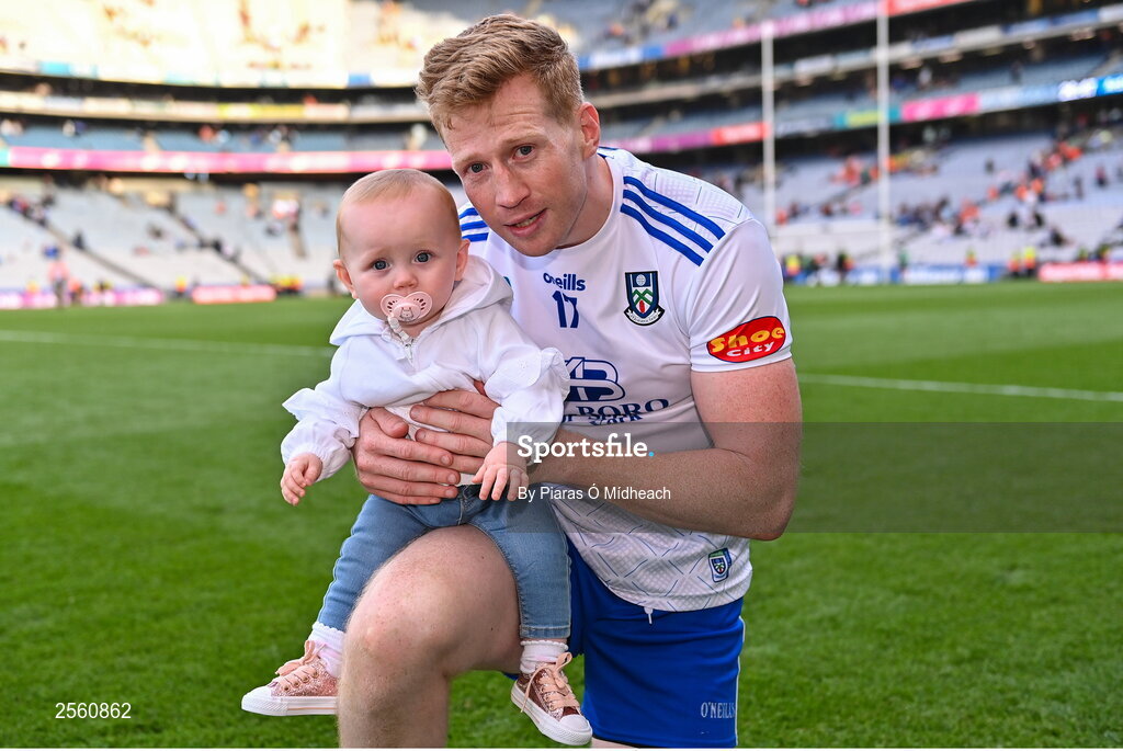 1 July 2023; Kieran Hughes of Monaghan with his daughter Cara, age 9 months, after the GAA Football All-Ireland Senior Championship quarter-final match between Armagh and Monaghan at Croke Park in Dublin. Photo by Piaras Ó Mídheach/Sportsfile