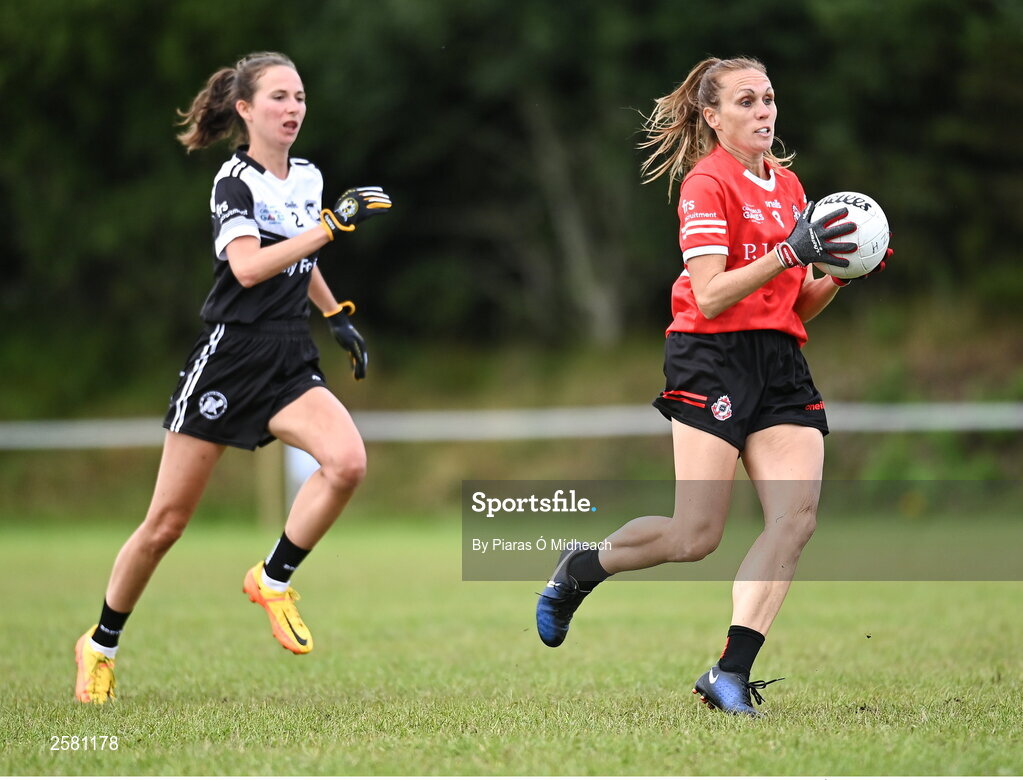 27 July 2023; Daphne Ballard of Canada in action against Johanna Duviver of Brittany during day four of the FRS Recruitment GAA World Games 2023 at the Owenbeg Centre of Excellence in Dungiven, Derry. Photo by Piaras Ó Mídheach/Sportsfile