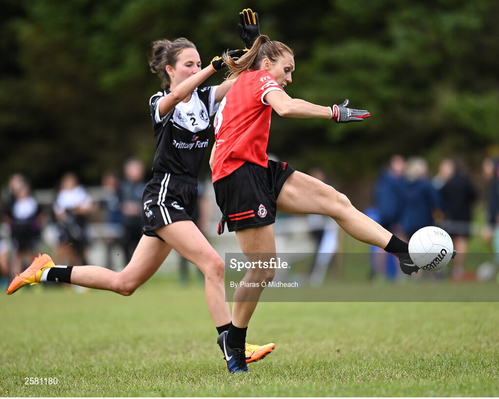 27 July 2023; Daphne Ballard of Canada in action against Johanna Duviver of Brittany during day four of the FRS Recruitment GAA World Games 2023 at the Owenbeg Centre of Excellence in Dungiven, Derry. Photo by Piaras Ó Mídheach/Sportsfile