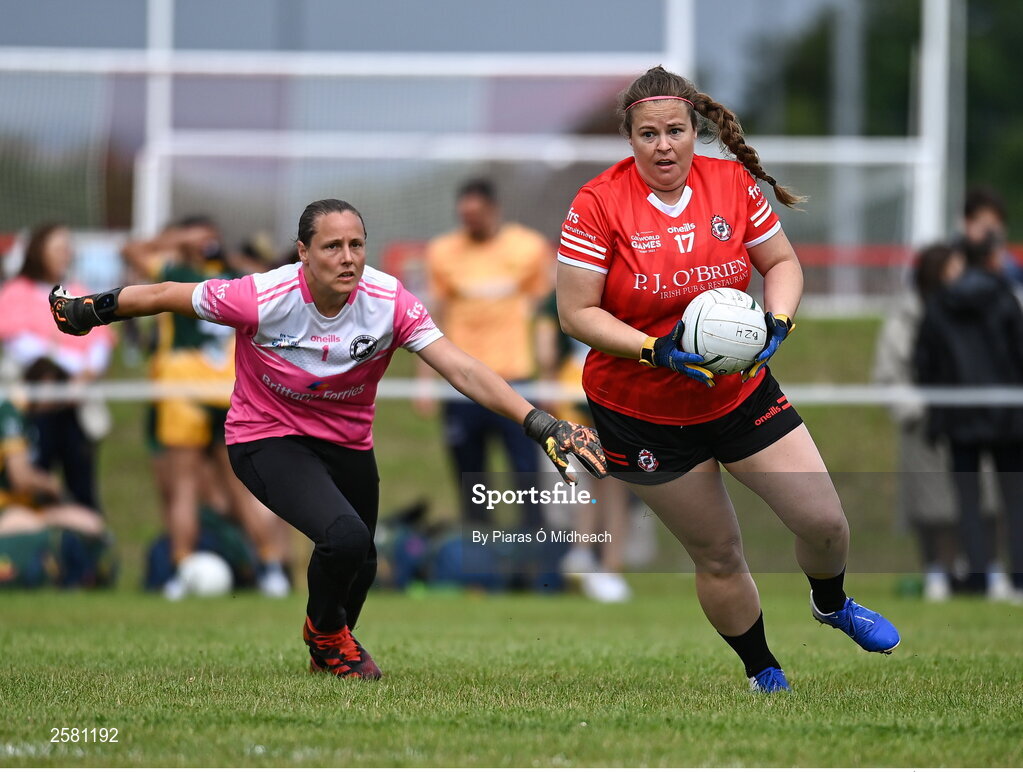 27 July 2023; Sarah Batley of Canada in action against Anne-Gabrielle Chiras of Brittany during day four of the FRS Recruitment GAA World Games 2023 at the Owenbeg Centre of Excellence in Dungiven, Derry. Photo by Piaras Ó Mídheach/Sportsfile