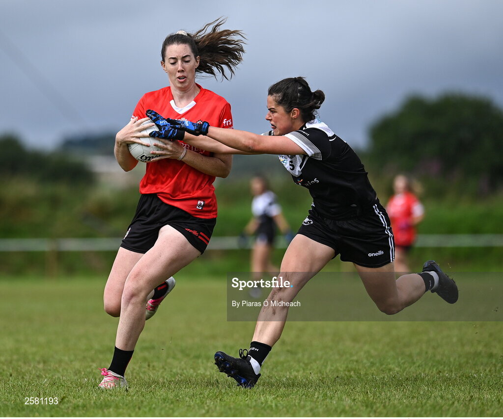 27 July 2023; Ciara Murphy of Canada in action against Elena Benoist of Brittany during day four of the FRS Recruitment GAA World Games 2023 at the Owenbeg Centre of Excellence in Dungiven, Derry. Photo by Piaras Ó Mídheach/Sportsfile