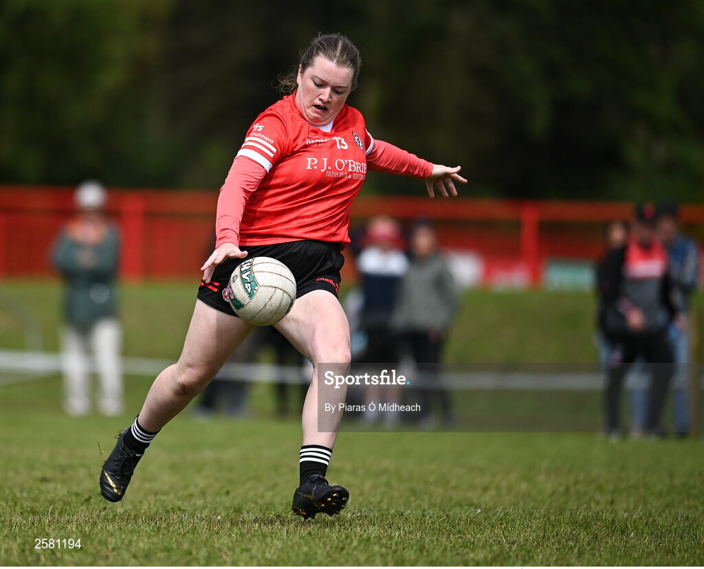 27 July 2023; Clodagh Keane of Canada in action against Brittany during day four of the FRS Recruitment GAA World Games 2023 at the Owenbeg Centre of Excellence in Dungiven, Derry. Photo by Piaras Ó Mídheach/Sportsfile