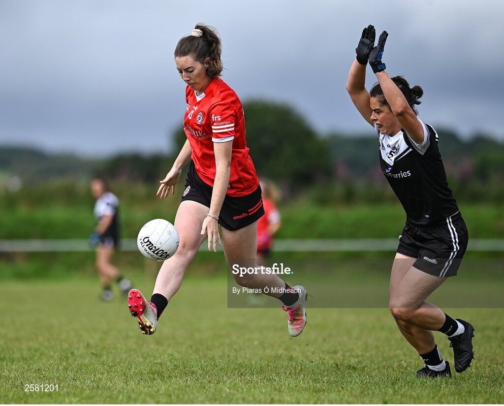 27 July 2023; Ciara Murphy of Canada in action against Elena Benoist of Brittany during day four of the FRS Recruitment GAA World Games 2023 at the Owenbeg Centre of Excellence in Dungiven, Derry. Photo by Piaras Ó Mídheach/Sportsfile