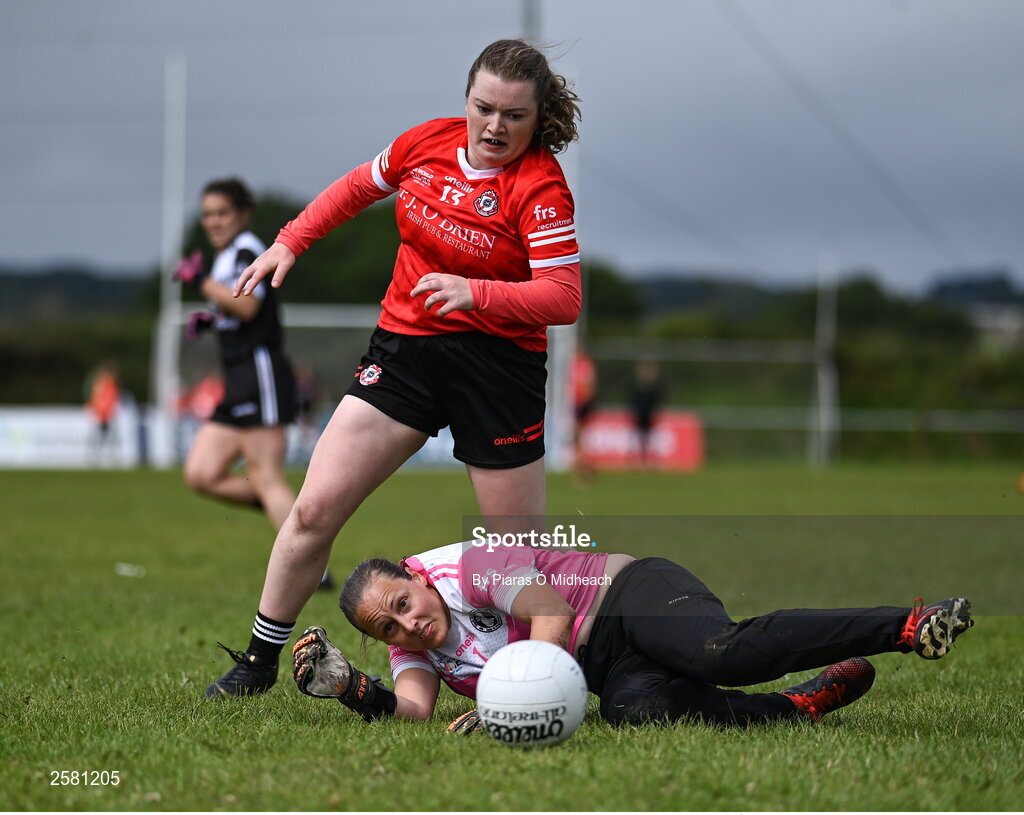 27 July 2023; Sarah Batley of Canada, behind, in action against Anne-Gabrielle Chiras of Brittany during day four of the FRS Recruitment GAA World Games 2023 at the Owenbeg Centre of Excellence in Dungiven, Derry. Photo by Piaras Ó Mídheach/Sportsfile