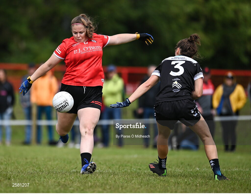 27 July 2023; Sarah Batley of Canada shoots under pressure from Pauline Bouric of Brittanty, 3, during day four of the FRS Recruitment GAA World Games 2023 at the Owenbeg Centre of Excellence in Dungiven, Derry. Photo by Piaras Ó Mídheach/Sportsfile