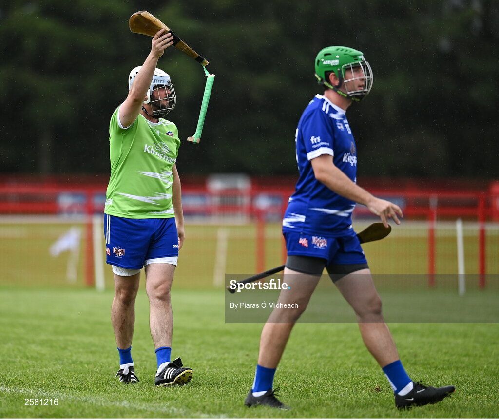 27 July 2023; South East 1 goalkeeper John Michael English looks for a replacement hurl during the match against Coastal Virginia during day four of the FRS Recruitment GAA World Games 2023 at the Owenbeg Centre of Excellence in Dungiven, Derry. Photo by Piaras Ó Mídheach/Sportsfile