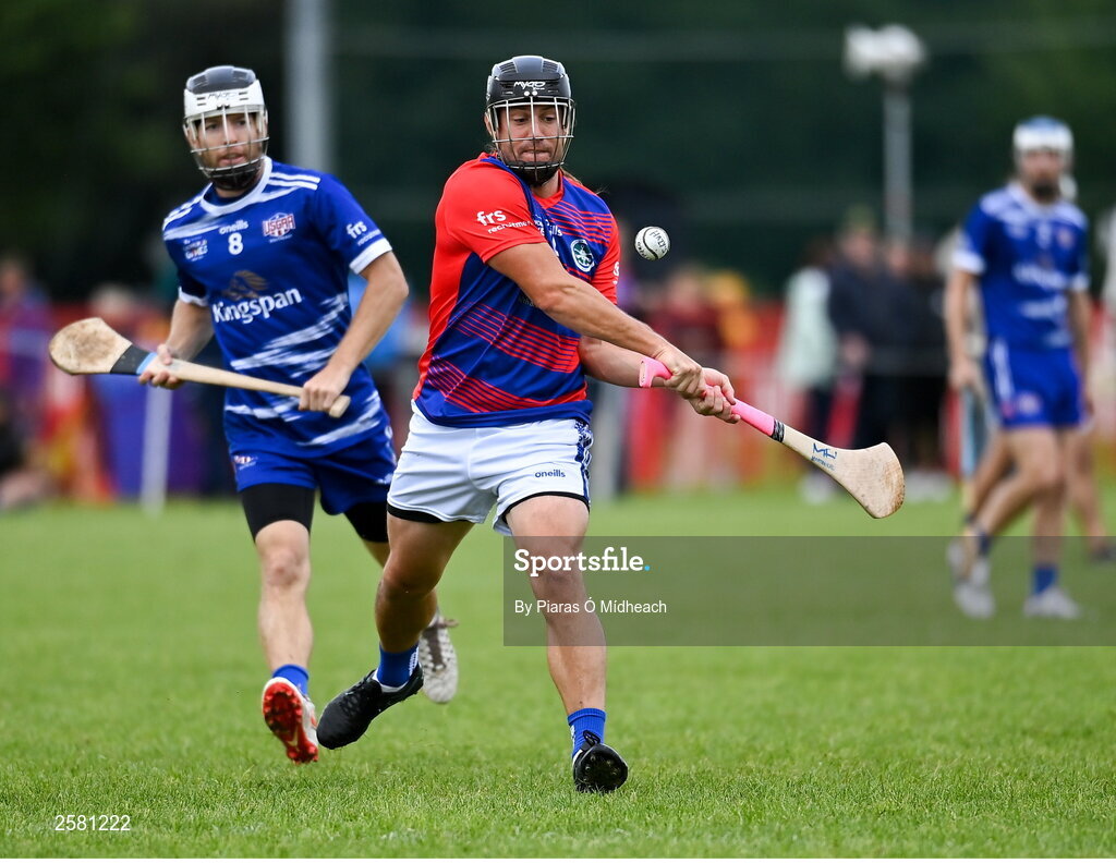 27 July 2023; Beau Bennett of Coastal Virginia in action against James Matthew Rasimowicz of South East 1, 8, during day four of the FRS Recruitment GAA World Games 2023 at the Owenbeg Centre of Excellence in Dungiven, Derry. Photo by Piaras Ó Mídheach/Sportsfile