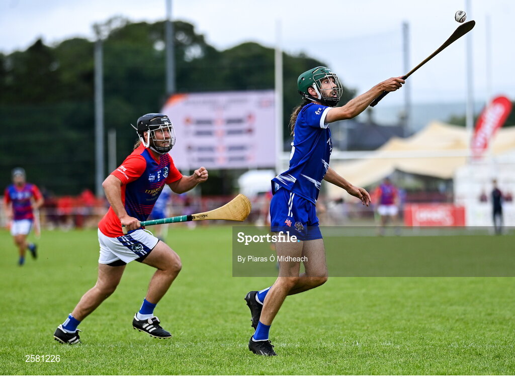 27 July 2023; Corbett Charles Oulette of South East 1, right, in action against Jason Yarashes of Coastal Virginia during day four of the FRS Recruitment GAA World Games 2023 at the Owenbeg Centre of Excellence in Dungiven, Derry. Photo by Piaras Ó Mídheach/Sportsfile