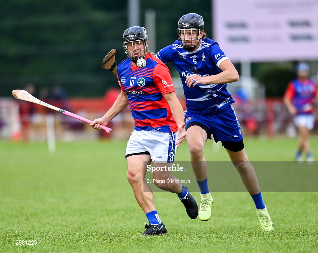 27 July 2023; Beau Bennett of Coastal Virginia, left, in action against David G O'Connor of South East 1 during day four of the FRS Recruitment GAA World Games 2023 at the Owenbeg Centre of Excellence in Dungiven, Derry. Photo by Piaras Ó Mídheach/Sportsfile