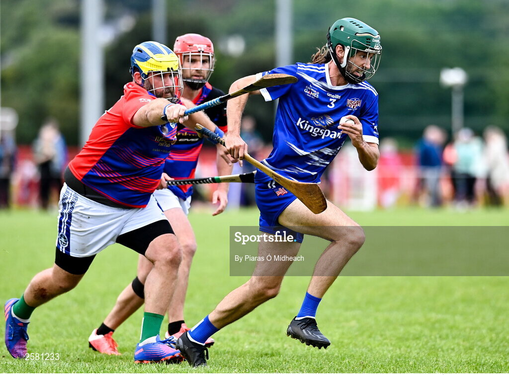 27 July 2023; Corbett Charles Oulette of South East 1, 3, in action against Seamus McVey of Coastal Virginia during day four of the FRS Recruitment GAA World Games 2023 at the Owenbeg Centre of Excellence in Dungiven, Derry. Photo by Piaras Ó Mídheach/Sportsfile
