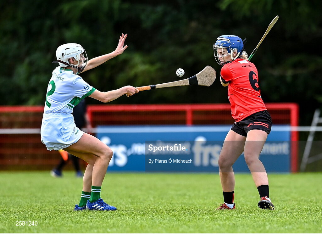 27 July 2023; Sinead O’Neill of Asia, 6, in action against Rachel Callanan of Britain 1 during day four of the FRS Recruitment GAA World Games 2023 at the Owenbeg Centre of Excellence in Dungiven, Derry. Photo by Piaras Ó Mídheach/Sportsfile