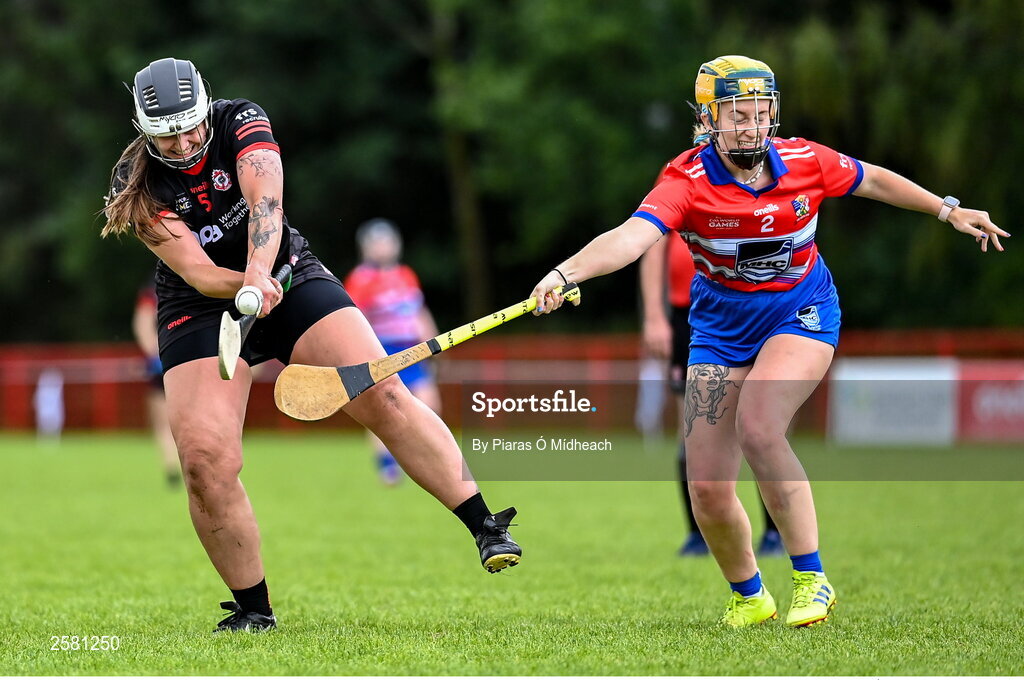 27 July 2023; Jenna Thompson of Canada in action against Jessica Frey of US Warriors, right, during day four of the FRS Recruitment GAA World Games 2023 at the Owenbeg Centre of Excellence in Dungiven, Derry. Photo by Piaras Ó Mídheach/Sportsfile