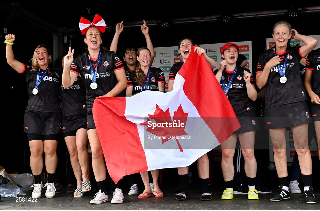 27 July 2023; Canada celebrate after winning the Camogie International Shield Final during day four of the FRS Recruitment GAA World Games 2023 at the Owenbeg Centre of Excellence in Dungiven, Derry. Photo by Piaras Ó Mídheach/Sportsfile