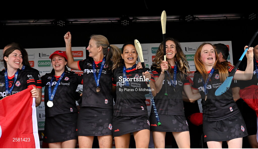 27 July 2023; Canada celebrate after winning the Camogie International Shield Final during day four of the FRS Recruitment GAA World Games 2023 at the Owenbeg Centre of Excellence in Dungiven, Derry. Photo by Piaras Ó Mídheach/Sportsfile