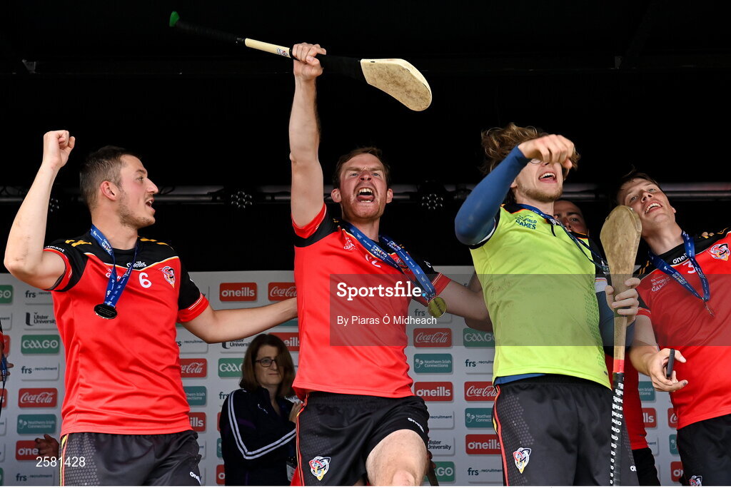 27 July 2023; Jakob Feldmann of Germany Red, centre, celebrates with teammates after winning the Hurling International Division 1 Plate Final during day four of the FRS Recruitment GAA World Games 2023 at the Owenbeg Centre of Excellence in Dungiven, Derry. Photo by Piaras Ó Mídheach/Sportsfile