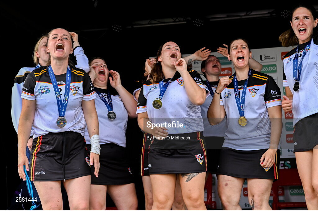 27 July 2023; Germany celebrate with their runner's up medals for the Camogie International Shield Final during day four of the FRS Recruitment GAA World Games 2023 at the Owenbeg Centre of Excellence in Dungiven, Derry. Photo by Piaras Ó Mídheach/Sportsfile