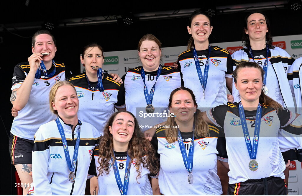 27 July 2023; Germany celebrate with their runner's up medals for the Camogie International Shield Final during day four of the FRS Recruitment GAA World Games 2023 at the Owenbeg Centre of Excellence in Dungiven, Derry. Photo by Piaras Ó Mídheach/Sportsfile