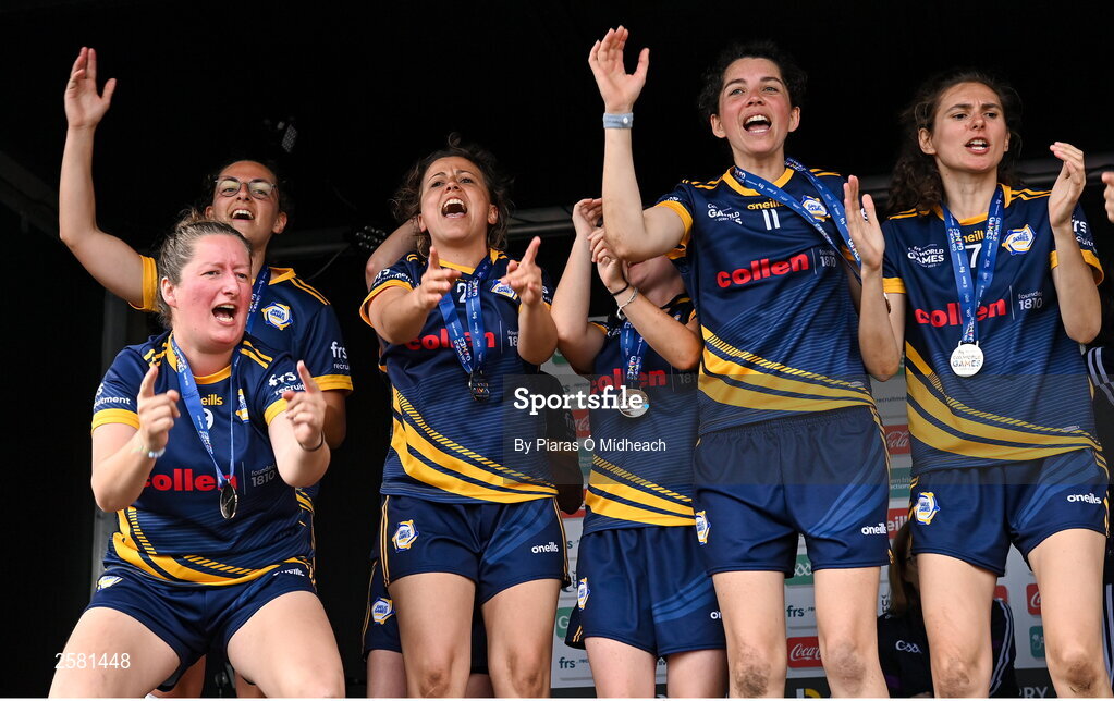 27 July 2023; Europe 1 celebrate after winning the Ladies Football International Plate Final during day four of the FRS Recruitment GAA World Games 2023 at the Owenbeg Centre of Excellence in Dungiven, Derry. Photo by Piaras Ó Mídheach/Sportsfile