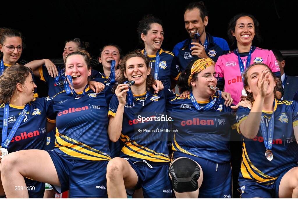 27 July 2023; Europe 1 celebrate after winning the Ladies Football International Plate Final during day four of the FRS Recruitment GAA World Games 2023 at the Owenbeg Centre of Excellence in Dungiven, Derry. Photo by Piaras Ó Mídheach/Sportsfile