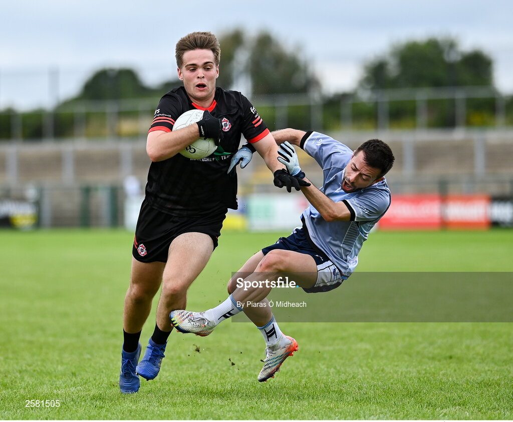 27 July 2023; Shane Gallagher of Canada gets past Alexandre Louzao Carreira of Galicia Blue during day four of the FRS Recruitment GAA World Games 2023 at the Owenbeg Centre of Excellence in Dungiven, Derry. Photo by Piaras Ó Mídheach/Sportsfile