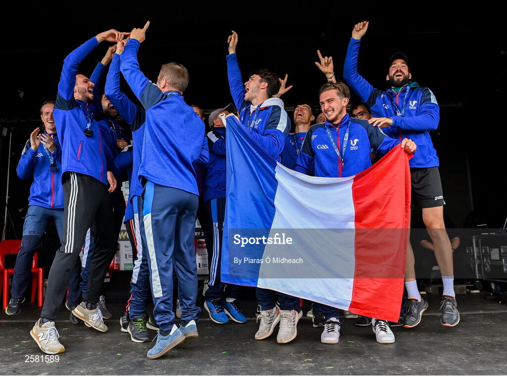 27 July 2023; France footballers celebrate during day four of the FRS Recruitment GAA World Games 2023 at the Owenbeg Centre of Excellence in Dungiven, Derry. Photo by Piaras Ó Mídheach/Sportsfile