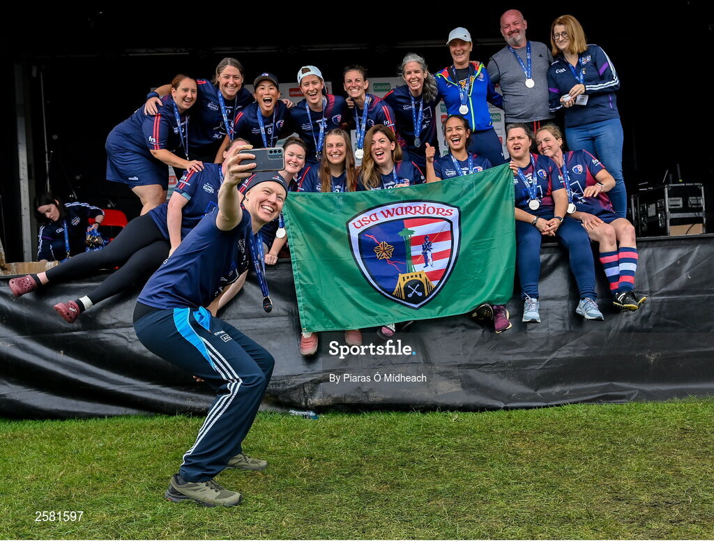 27 July 2023; Vanessa Asari of US Warriors takes a selfie with her camogie team-mates during day four of the FRS Recruitment GAA World Games 2023 at the Owenbeg Centre of Excellence in Dungiven, Derry. Photo by Piaras Ó Mídheach/Sportsfile