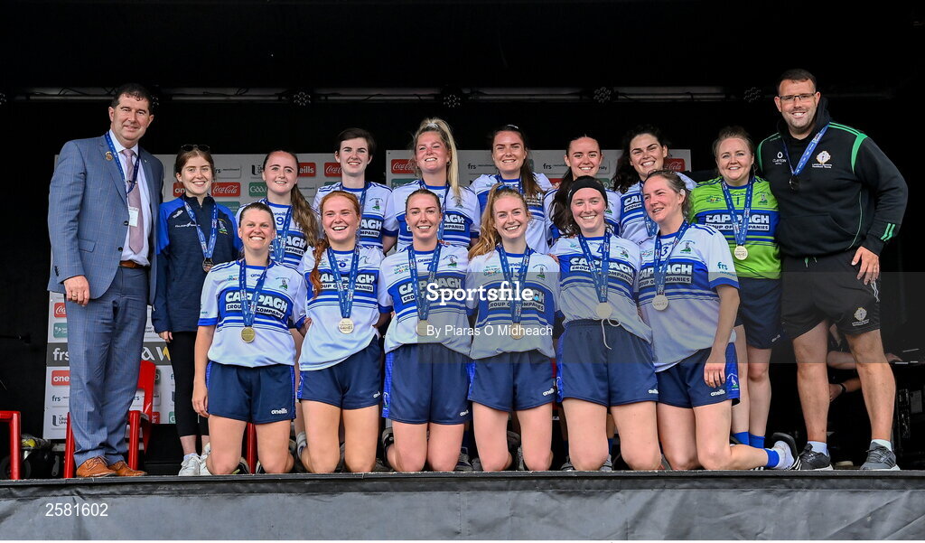 27 July 2023; Round Towers London celebrate after winning the Ladies Footall Shield Final during day four of the FRS Recruitment GAA World Games 2023 at the Owenbeg Centre of Excellence in Dungiven, Derry. Photo by Piaras Ó Mídheach/Sportsfile
