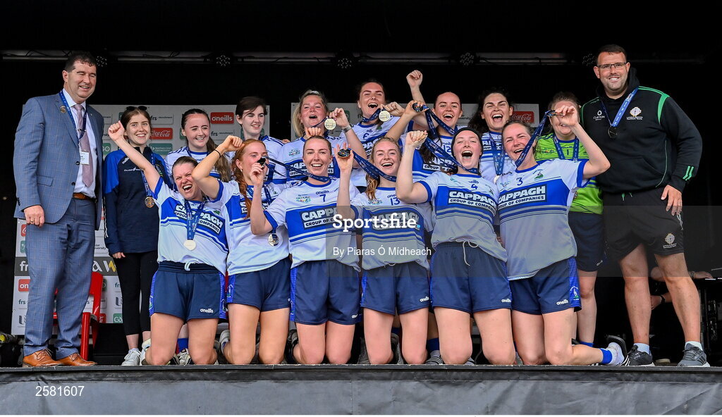 27 July 2023; Round Towers London celebrate after winning the Ladies Footall Shield Final during day four of the FRS Recruitment GAA World Games 2023 at the Owenbeg Centre of Excellence in Dungiven, Derry. Photo by Piaras Ó Mídheach/Sportsfile